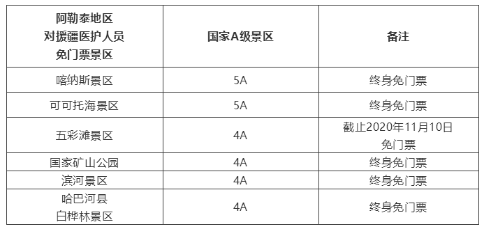 有着“人类滑雪起源地”之称的阿勒泰,有丰富的高山森林、河谷风光、湖泊温泉、岩画石刻等旅游资源。并且阿勒泰地区拥有独特的冰雪资源和气候优势,非常适合开展冰雪运动和冬季旅游,在此次对援疆抗疫医护人员表达感激之情的同时,阿勒泰地区的部分5A、4A级景区也将会对援疆抗疫医护人员本人采取终身免门票政策。